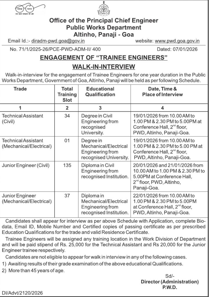 Home Uncategorized PWD announces walk-in interviews for 207 trainee engineer posts Uncategorized PWD announces walk-in interviews for 207 trainee engineer posts By Digital Goa - January 9, 2026