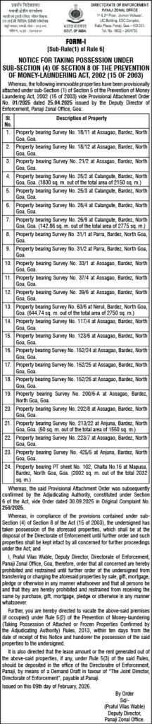Home Uncategorized ED takes possession of 24 Goa properties under Prevention of Money Laundering... Uncategorized ED takes possession of 24 Goa properties under Prevention of Money Laundering Act By Digital Goa - February 27, 2026