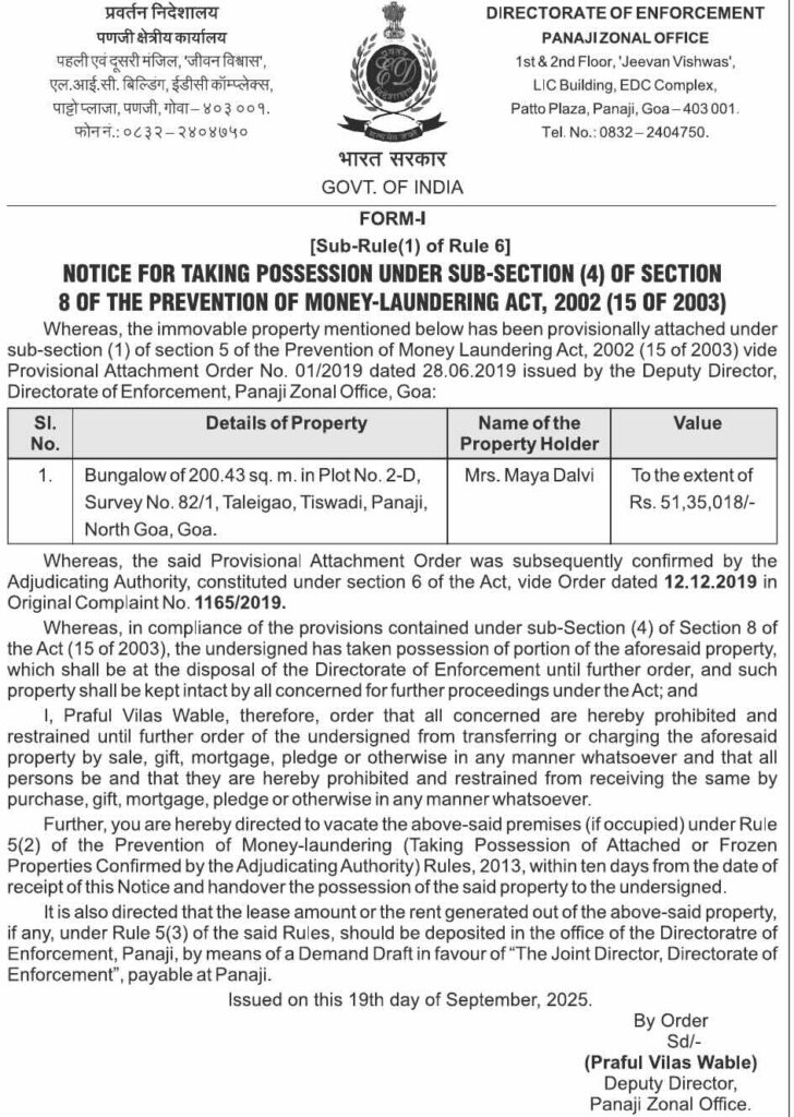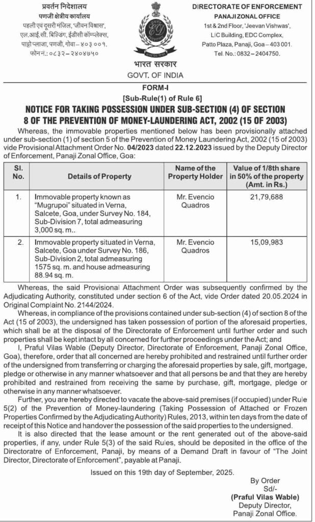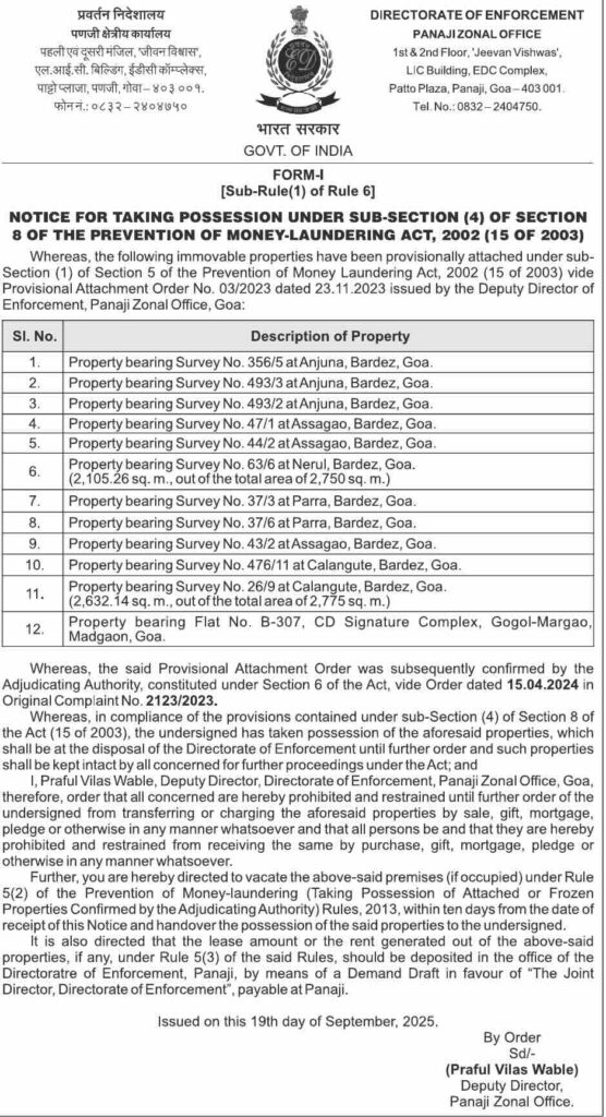 Home Uncategorized ED takes possession of multiple properties across Goa under PMLA Uncategorized ED takes possession of multiple properties across Goa under PMLA By Digital Goa - September 22, 2025