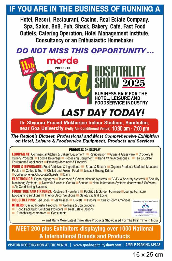 Home Uncategorized Goa Hospitality Show 2025 Uncategorized Goa Hospitality Show 2025 By Digital Goa - August 22, 2025 ▪️Last Day of Goa Hospitality Show 2025▪️Business fair for the Hotel, Leisure and Foodservice Industry▪️on Aug 21, 22 at SPM Stadium from 10;30am-7pm .Bambolim GOA