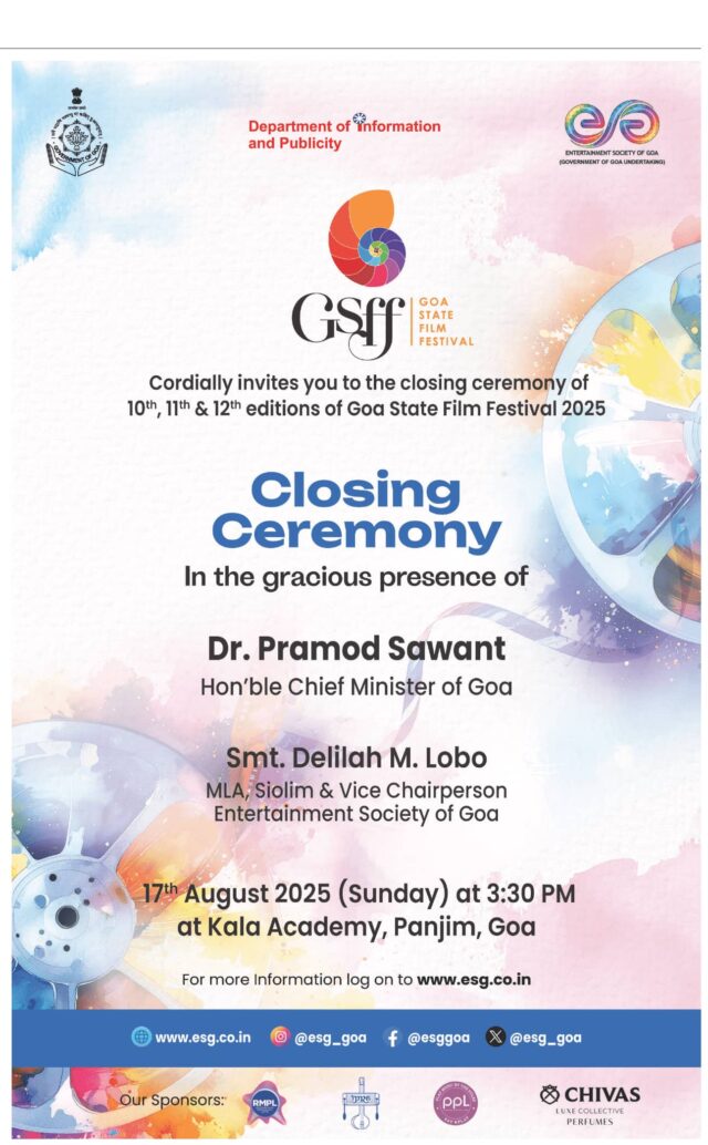 The curtains will come down today on the 10th, 11th and 12th editions of the Goa State Film Festival 2025, which began on August 14. The four-day mega cinematic celebration was organised by the Department of Information and Publicity in association with the Entertainment Society of Goa (ESG), with screenings held at Maquinez Palace and Inox, Panaji.