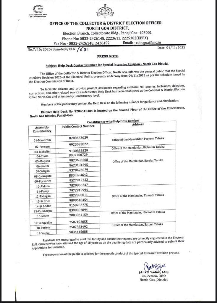 Home News Help desks set up for Special Intensive Revision 2026 to assist voters... NewsPolitics Help desks set up for Special Intensive Revision 2026 to assist voters in Goa By Digital Goa - November 3, 2025 Help Desks for North Goa Help Desk for South Goa