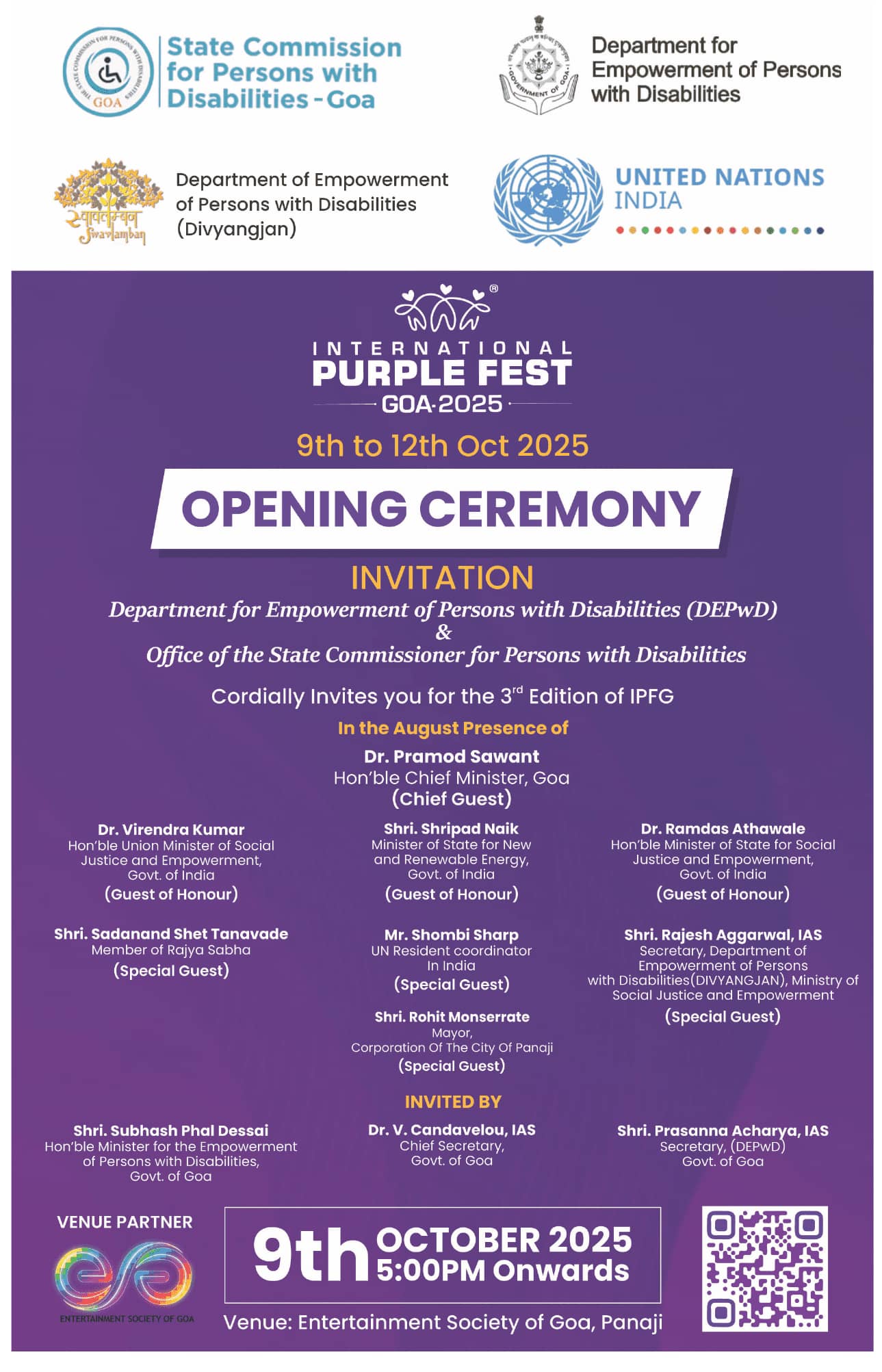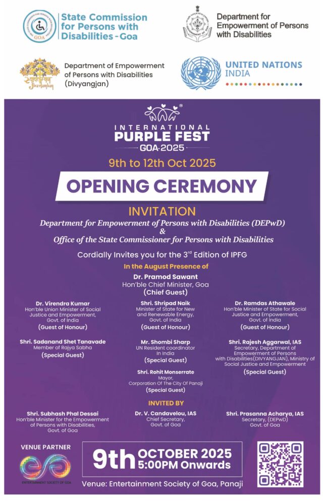 Goa is all set to host the third edition of the International Purple Fest (IPF) 2025, a four-day celebration of inclusivity and empowerment for persons with disabilities (PwDs), from October 9 to 12 at the Entertainment Society of Goa (ESG), Panaji.