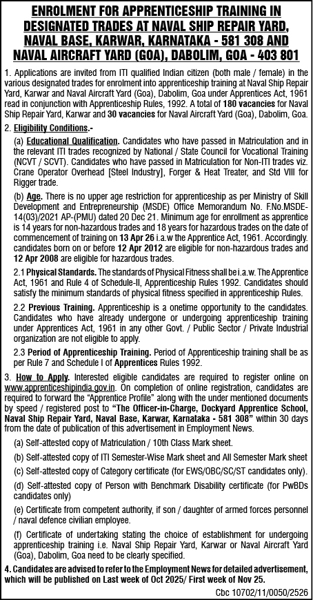 210 apprenticeship posts announced at Indian Navy Establishments at Karwar and Goa