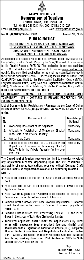 Tourism dept invites applications for temporary shack registrations and renewals in private properties for 2025-26 season