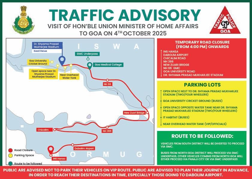 Home Uncategorized Traffic restrictions and road diversions in place for Shah’s visit Uncategorized Traffic restrictions and road diversions in place for Shah’s visit By Digital Goa - October 4, 2025