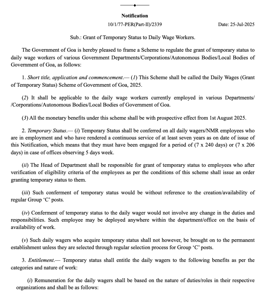 Notification – Grant of Temporary Status to Daily Wage Workers