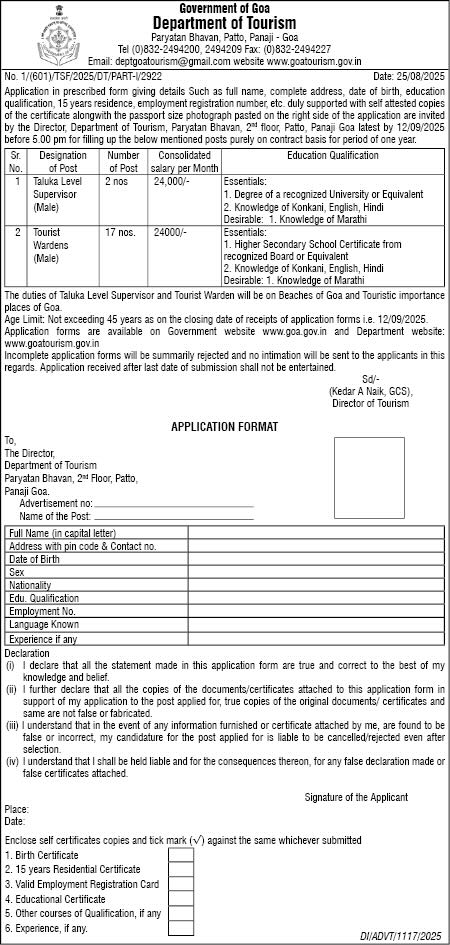 Home News Tourism dept invites applications for 19 contractual posts NewsUncategorized Tourism dept invites applications for 19 contractual posts By Digital Goa - August 26, 2025