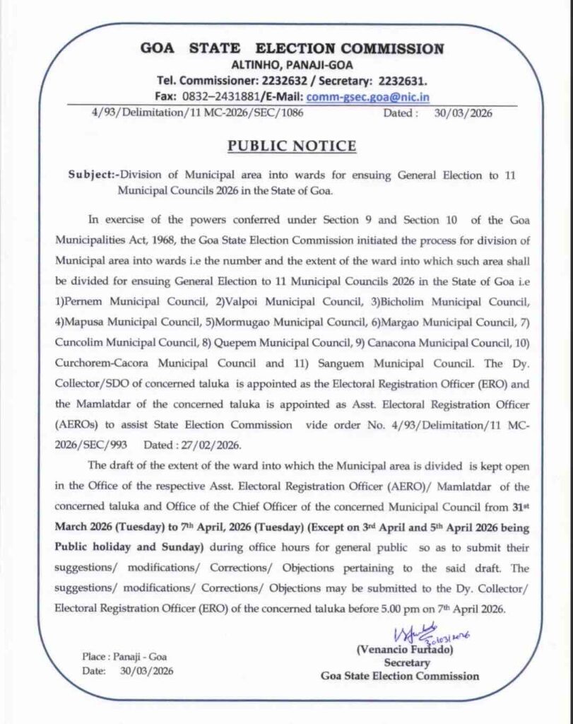Home Uncategorized Public feedback on draft municipal ward delimitation for 2026 polls Uncategorized Public feedback on draft municipal ward delimitation for 2026 polls By Digital Goa - March 31, 2026